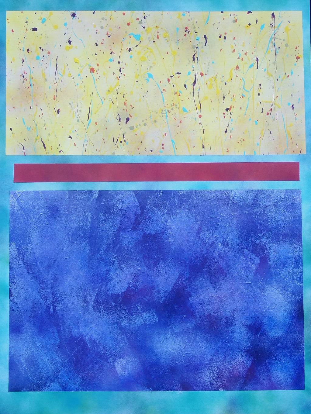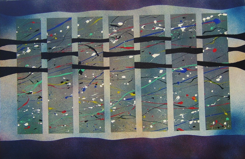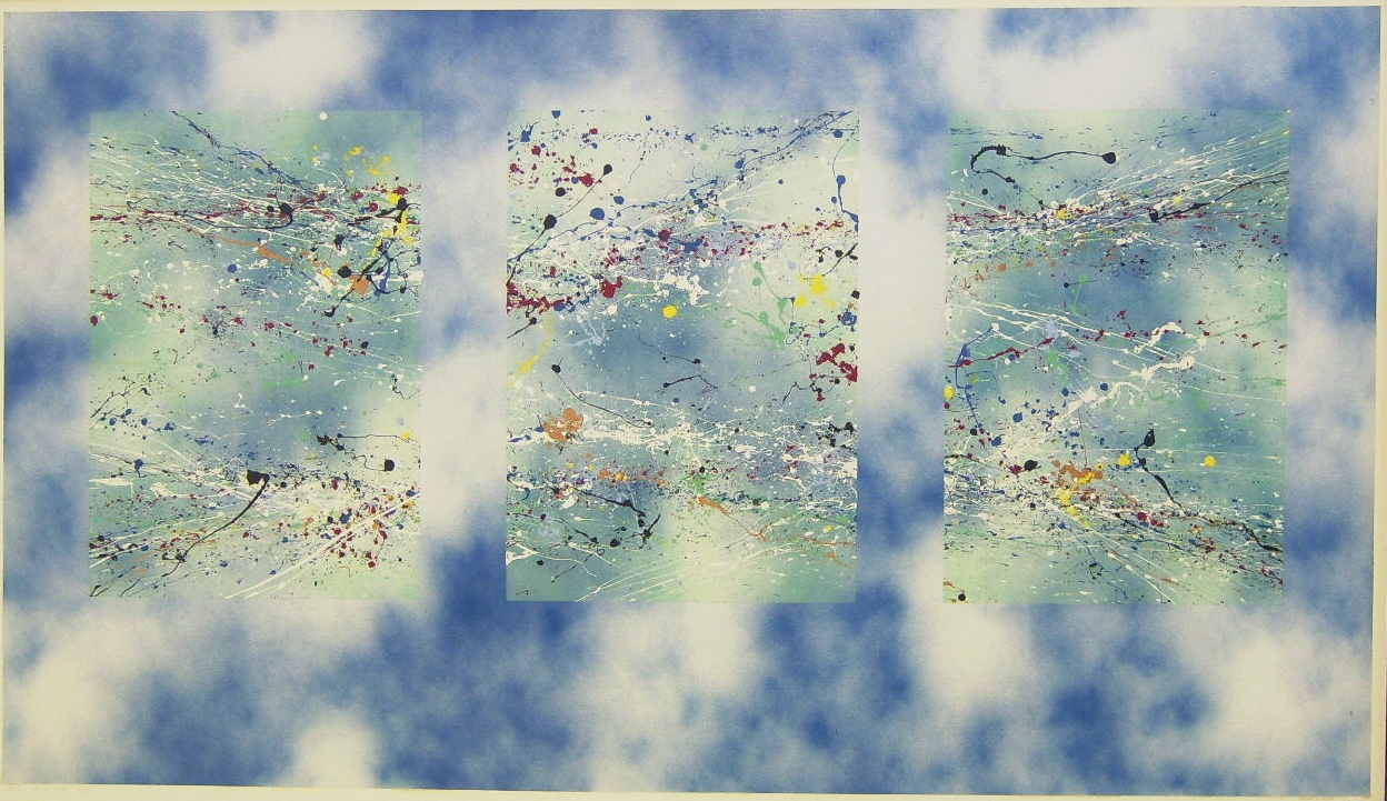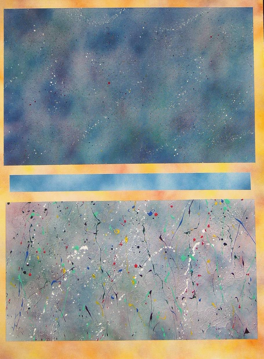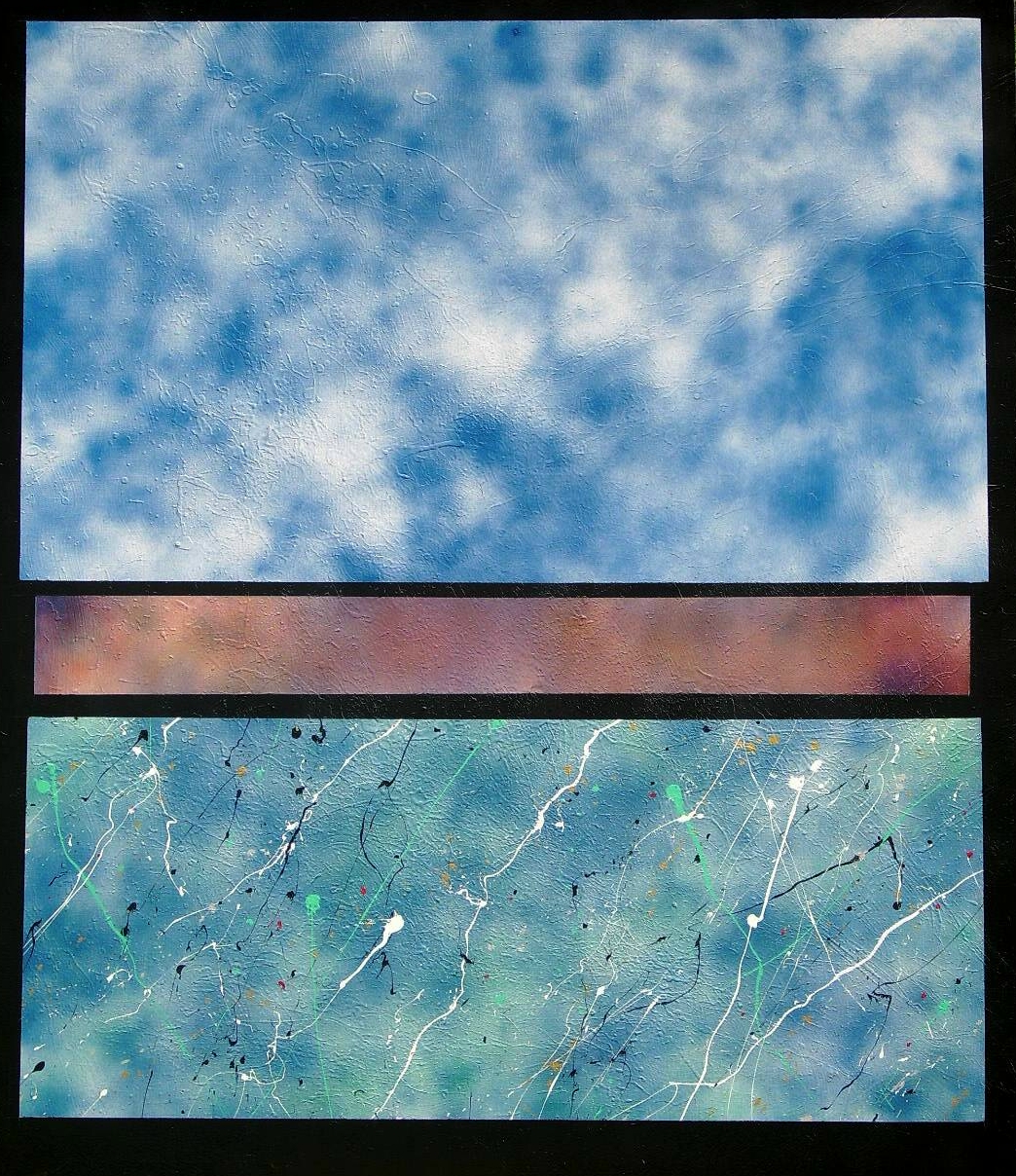 A complex palate of colors of thrown-on paint flows through rectangular compositions in front of a cloud-like background. The implication is the continuation of the energetic lines of paint across the space intervening between the rectangular fields. The continuation of the "Order Out of Chaos" series is based on monumental vertical compositions of squares and rectangles that are abstracted from the core of landscape painting ie: Foreground, Background and the Horizontal Line intersecting them. This monolithic composition is articulated with different approaches to treating the squares and rectangles with surface textures and color modulations to explore the emotional and mythological responses to this primal format.