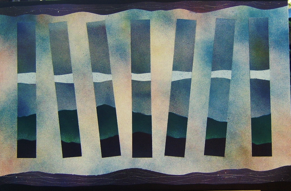 These works explore how the eye relates to sequential pieces of images or surfaces organized in horizontal compositions. The canvases have a series of rectangular pillars of various thickness arranged in a horizontal line across the canvas. The surfaces are painted in a variety of techniques so that there is a unique quality to each of the compositions. Some use a classic landscape horizon running through the pillars so that the viewer's eye begins to link the elements of the landscapes together to create a continuum. Others are totally abstract with ribbons of interweaving through the pillars. Some have "spirit walks" of thrown on paint that have been a feature of some of my past work. In this series I am also exploring how the eye reacts to the pillars of landscapes being tilted in various ways.